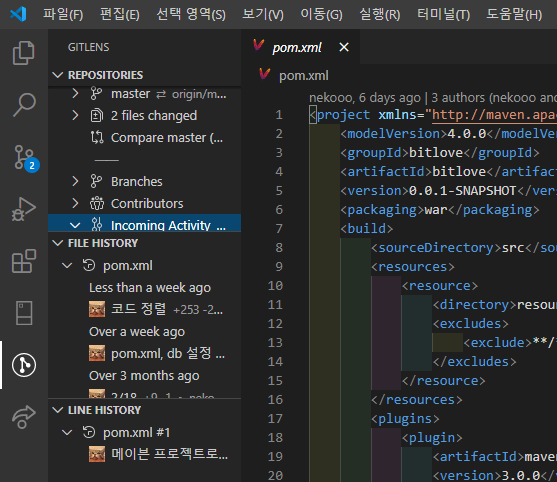 Git Lens : 파일을 열고 좌측에 Git Lens 아이콘 클릭시 git commit 이력 확인 가능