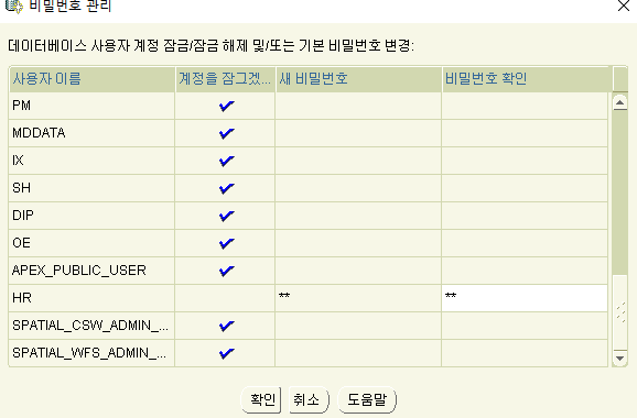 4. 연습용으로 많이 쓰는 HR 계정 해제를 하기 위해 아래와 같이 HR 계정 옆 체크를 해지 후 비밀번호 입력 후 확인