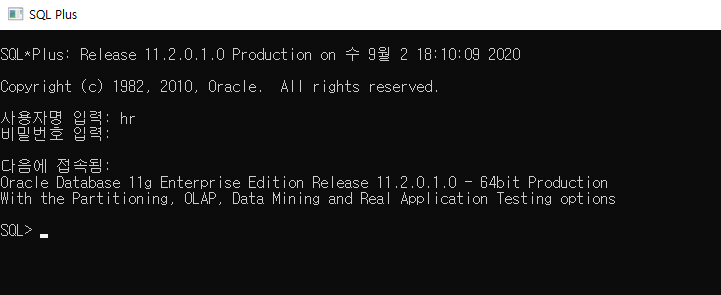5. 설치 확인을 위해 시작 프로그램에서 설치된 프로그램중 SQL Plus 실행 후 HR 계정 및 설정한 비밀번호를 입력 해서 연결 확인