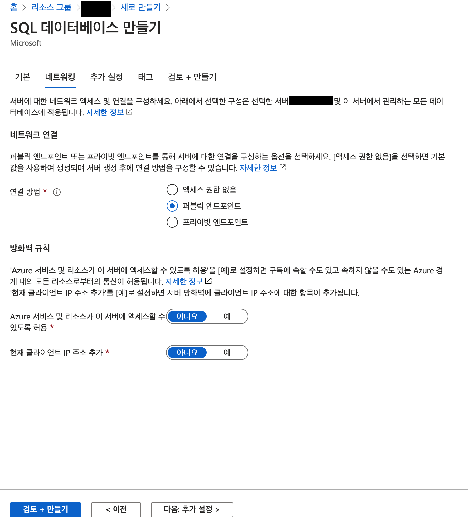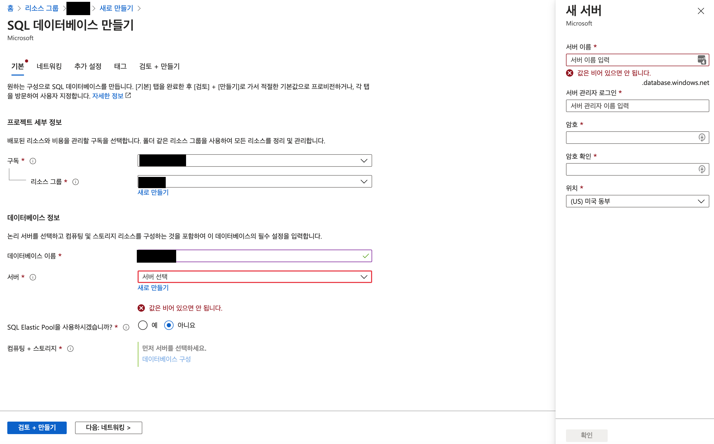 기존 생성한 서버가 없는 경우 데이터베이스를 사용할 서버를 선택(만들기)를 진행