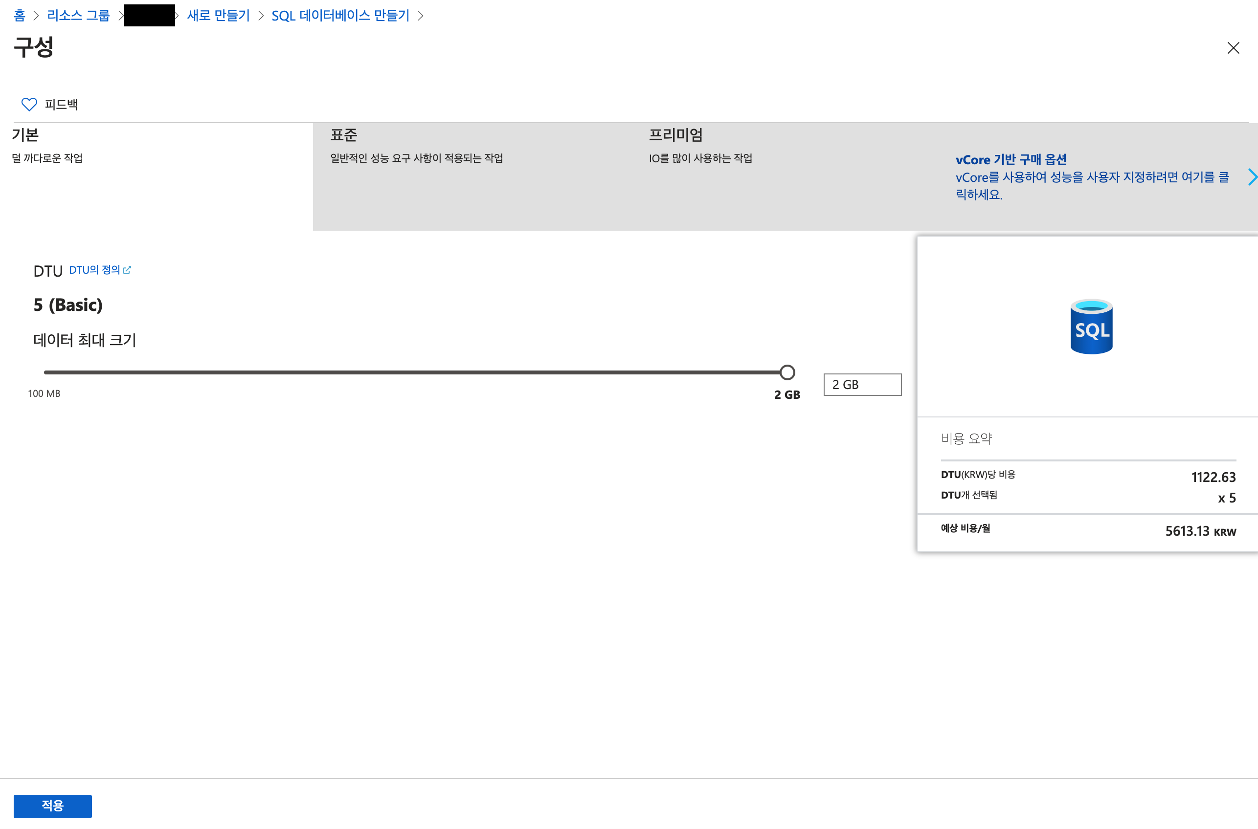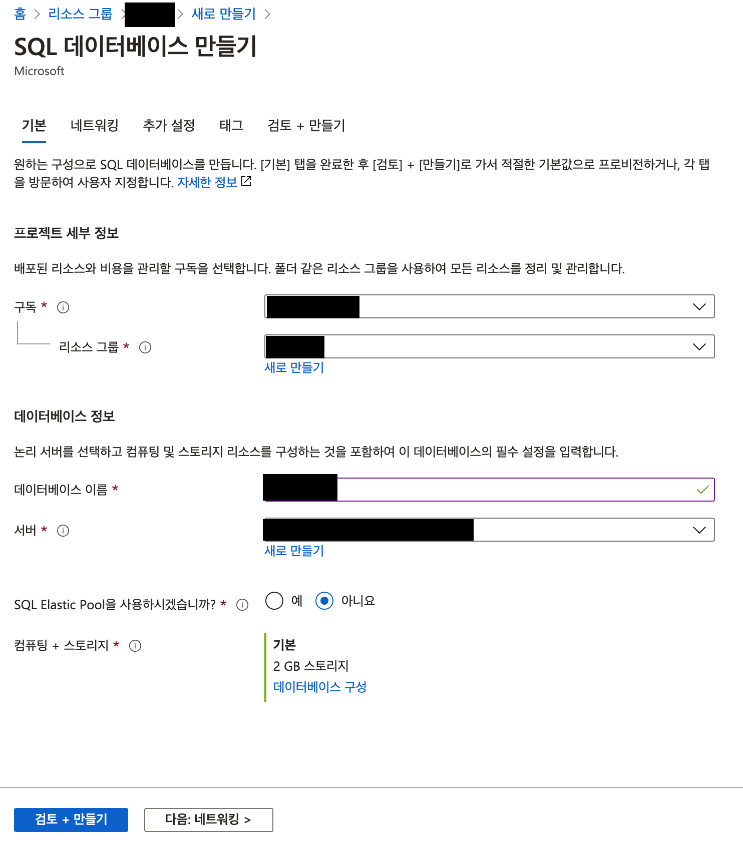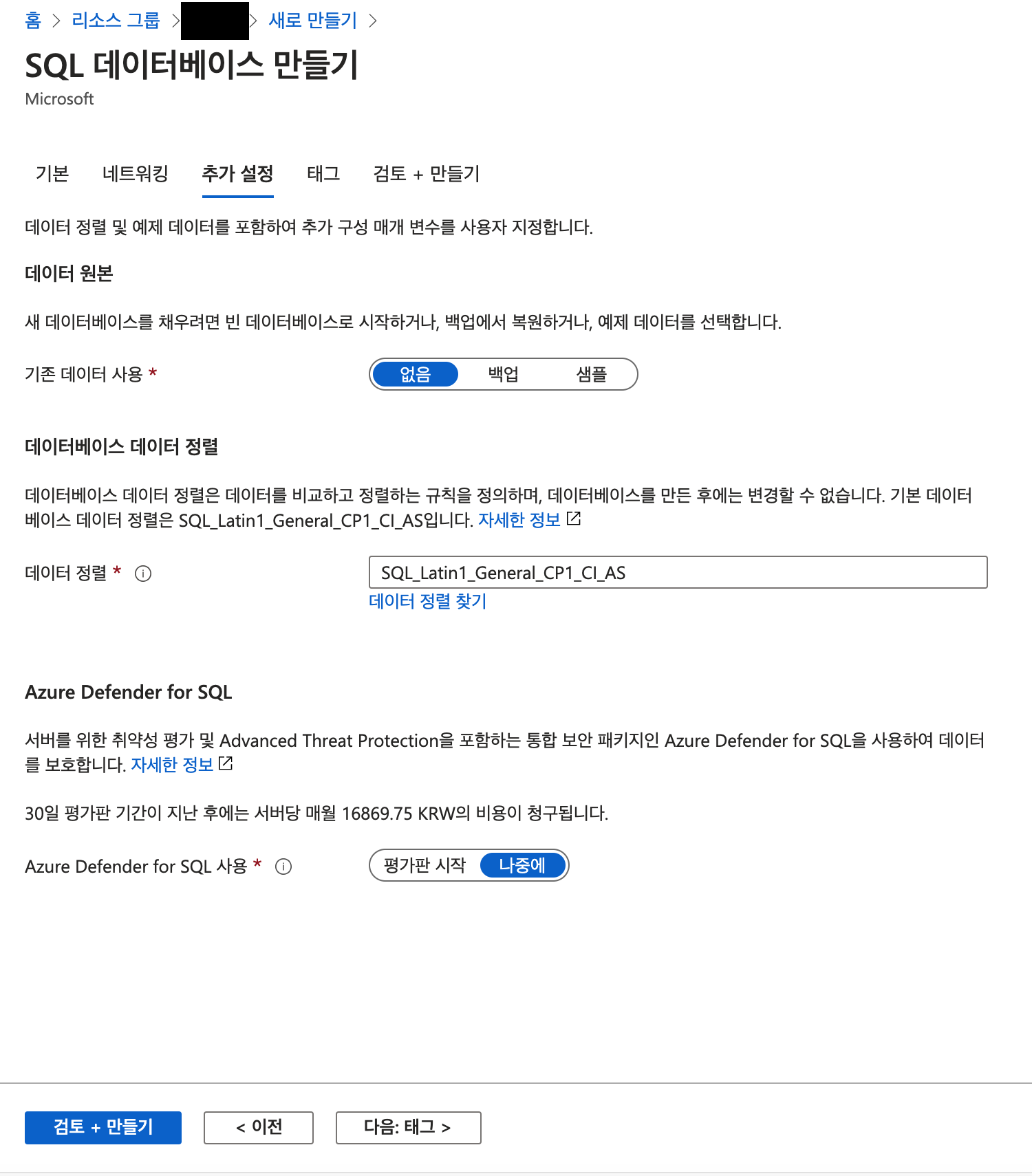 데이터베이스 이름은 내리소스그룹 내에서만 유일하게 입력