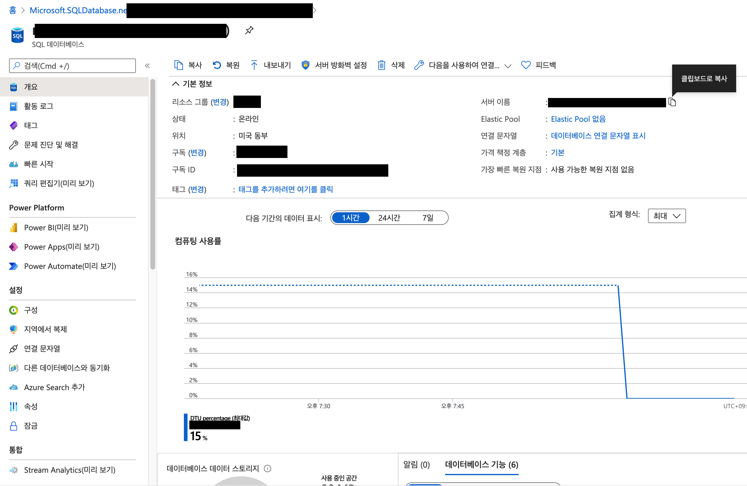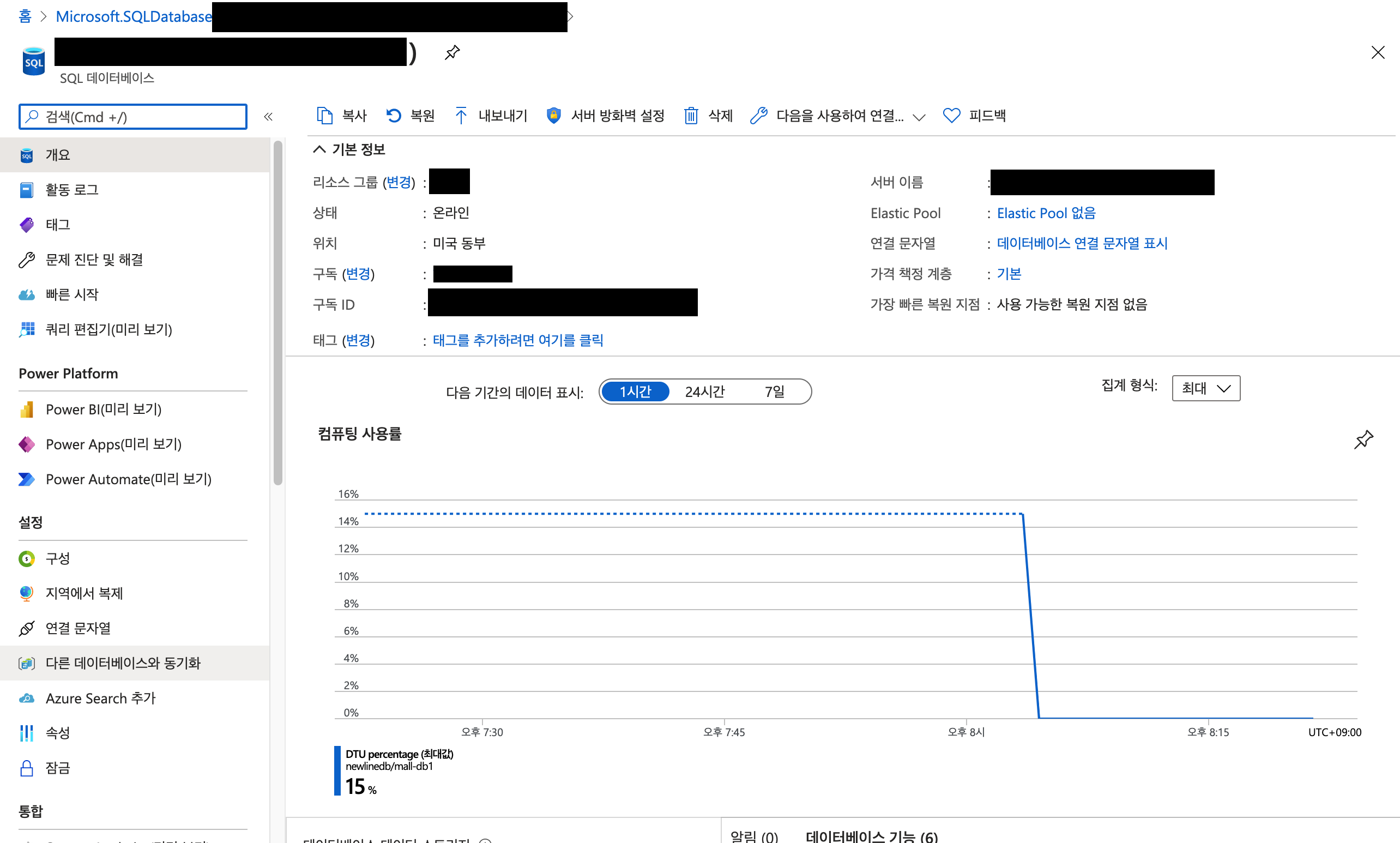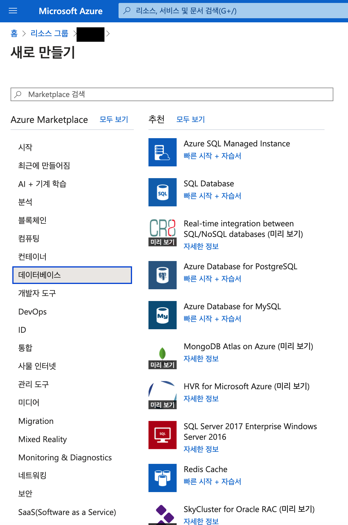 데이터베이스 이름은 내리소스그룹 내에서만 유일하게 입력