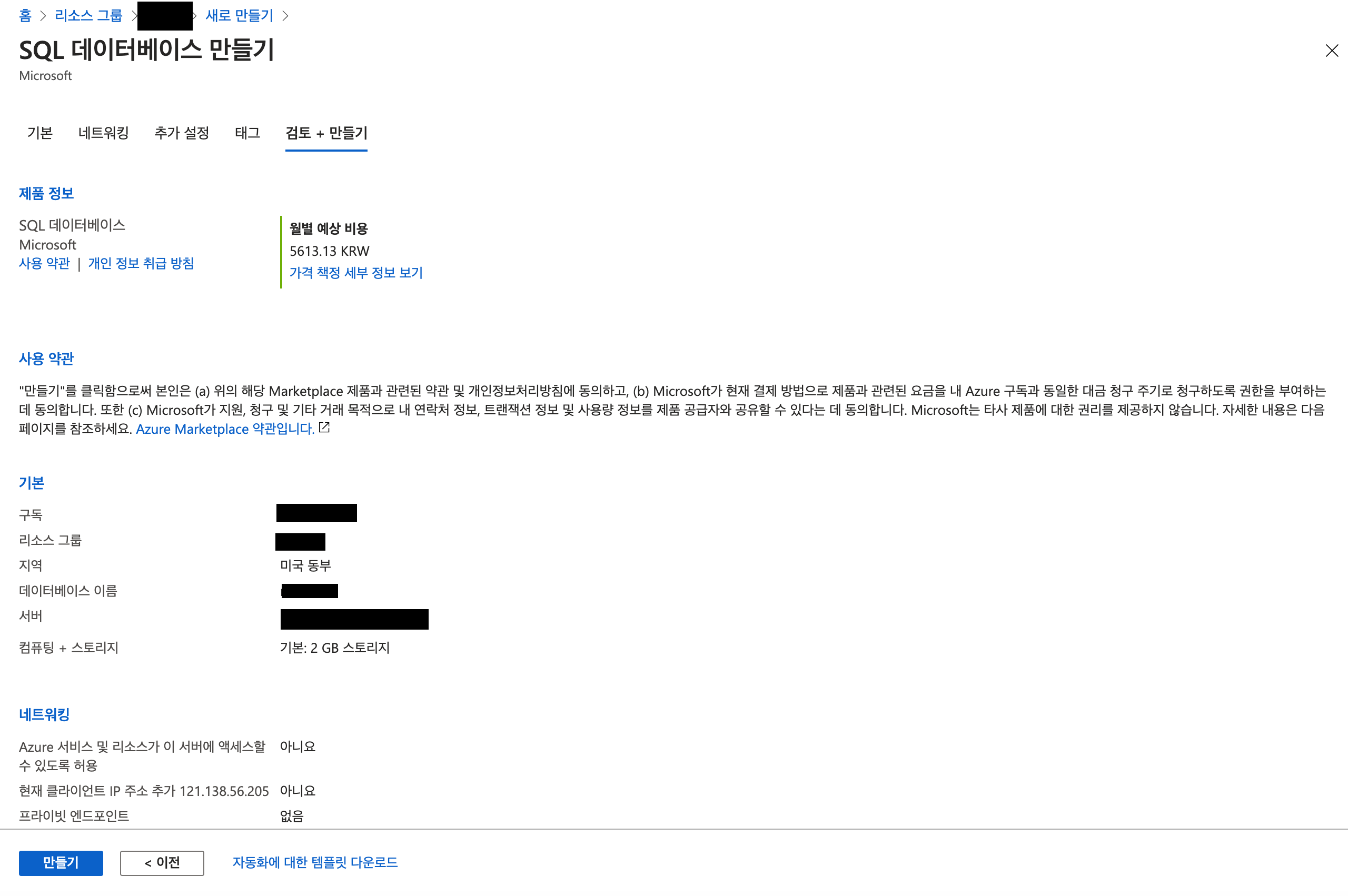 14. 가격 및 설정값들을 확인 후 만들기 클릭