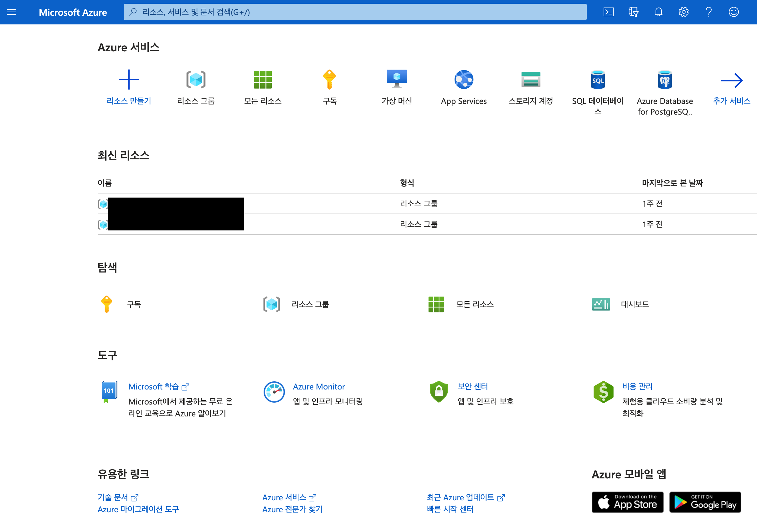 1. Azure Portal 접속 (portal.azure.com) - 리소스 그룹 클릭 (리소스 그룹을 만들지 않은 경우)