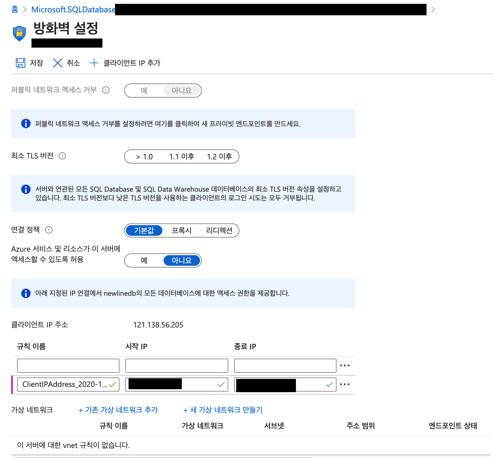 21. Azure Portal에서 생성된 데이터베이스 리소스 화면에서 서버 방화벽 설정 클릭